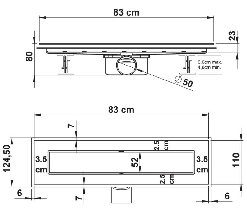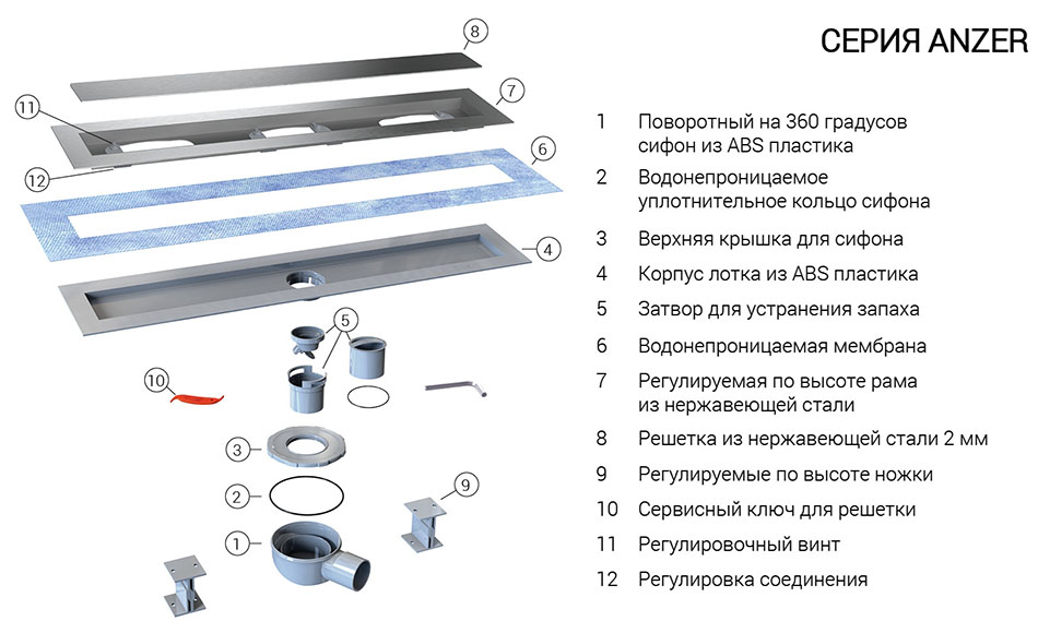Поворотный сифон 360 градусов из ABS-пластика, водонепроницаемые уплотнительные кольца, дренажный канал из ABS-пластика, противозапаховый затвор, водонепроницаемая мембрана, рамка и решетка из нержавеющей стали 2 мм, комплект регулируемых по высоте опор, пластиковый сервисный ключ, регулировочный винт из нержавеющей стали, регулировка соединения.