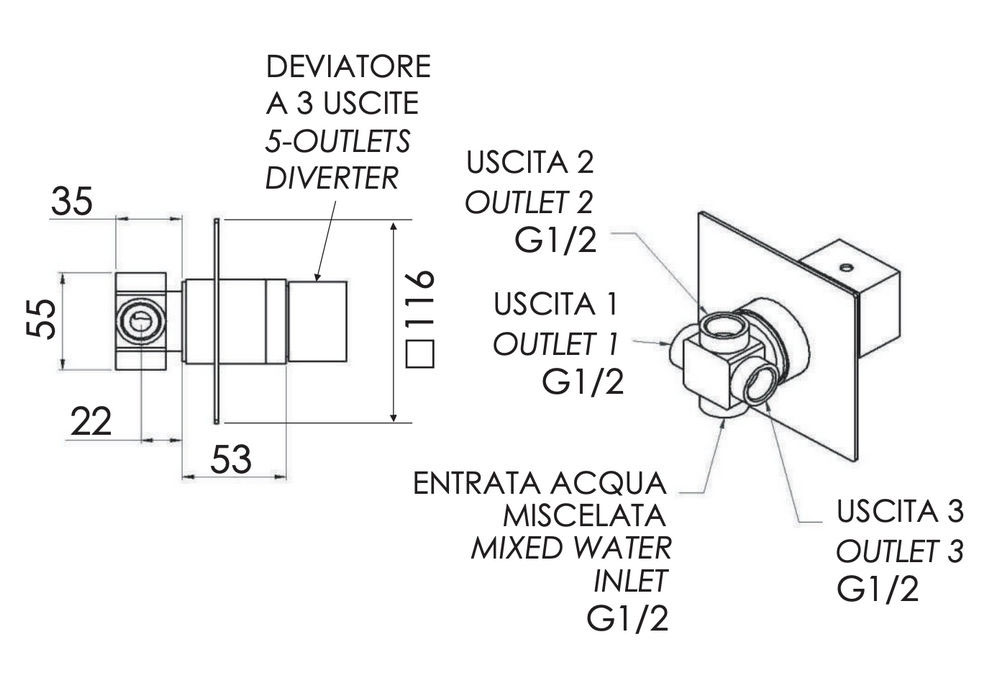 Дивертер на 3 выхода Remer Qubika Q93DEV3NO, черный матовый купить в Гомеле, цена