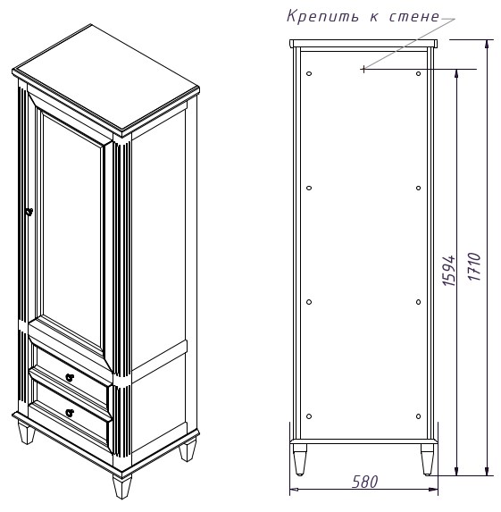 Шкаф-пенал с 2 ящиками и дверью (левое открывание), Верхний фасад со стеклом, выпускается в отделках из Реестра отделок мебели CLASSIC, внутри 2 полки