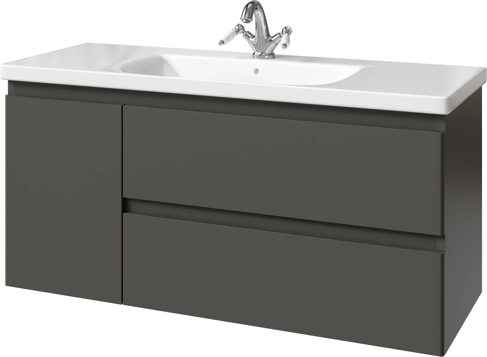 Тумба подвесная для раковины 120 см с 2 ящиками и 1 дверью (слева). Ручки интегрированные в фасадах. Выпускается в Матовых и Текстурированных отделках из реестра MODERN (ограничение по глянцевым отделкам).