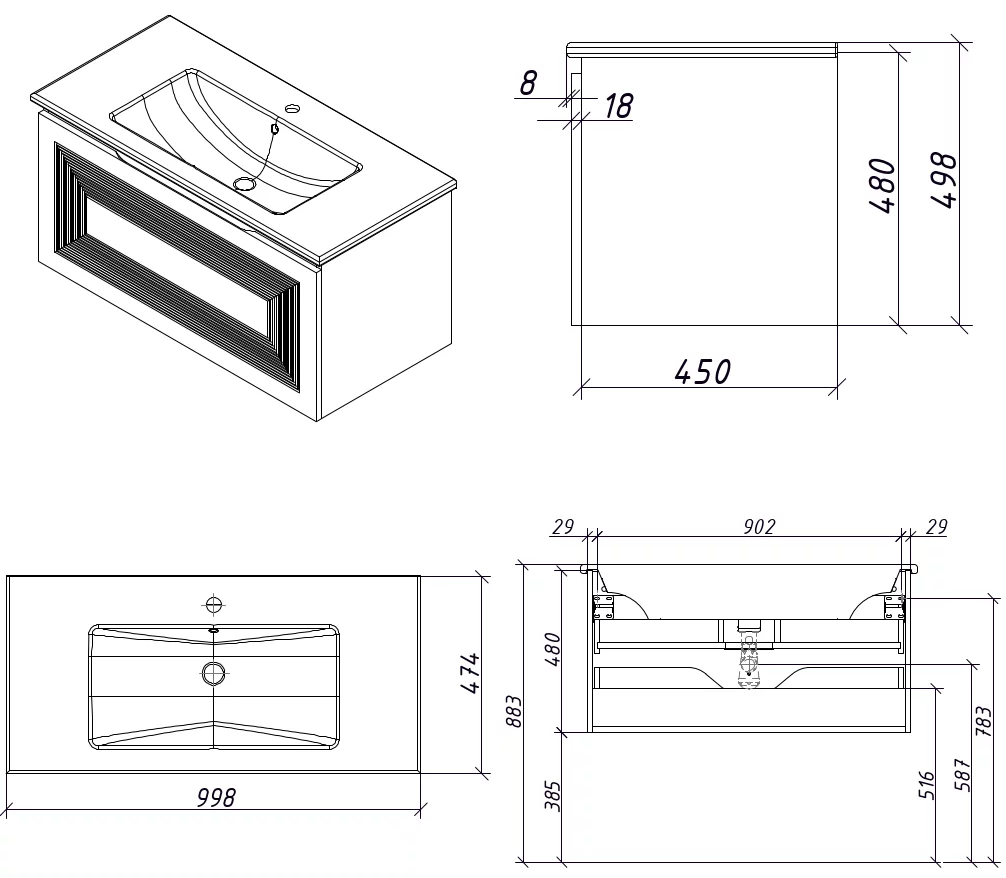 Тумба подвесная для раковины 100 см с 2 ящиками (с 1 скрытым ящиком).