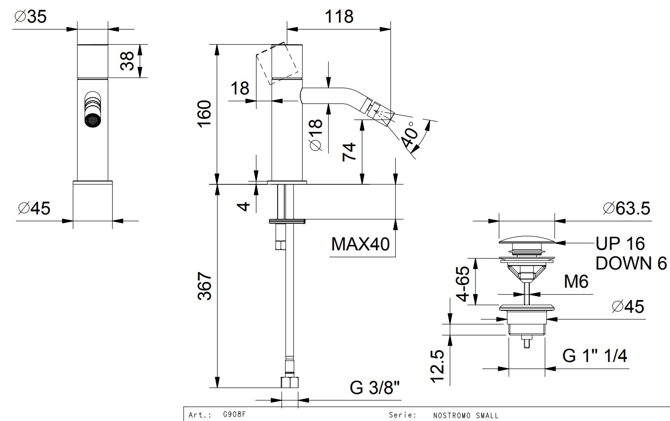 5013G908F NOSTROMO SMALL Смеситель для биде на 1 отверстие вылет 12 см Ручки: ЦИЛИНДРИЧЕСКАЯ и РУЧКА-РЫЧАГ ограничитель потока воды до 5 л/мин при 3 бар видимый аэратор подводка ДОННЫЙ КЛАПАН НАЖИМНОГО ТИПА - Черный матовый