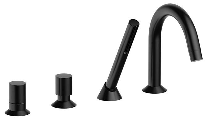50131665 NOSTROMO Набортный смеситель для ванны вылет 19,5 см ручки на 4 отверстия переключатель на 2 потока с кнопкой ручная лейка SUN гибкий шланг 150 см впуски 1/2'' подводка N.B. ручной душ FIT отделка PVD - Черный матовый
