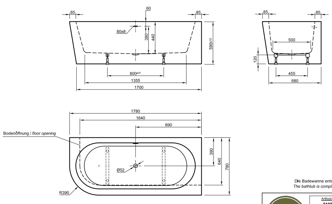 Каждая ванна поставляется с подробным шаблоном для сверления пола.
