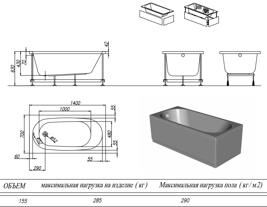Ванна представлена в 6 востребованных размерах.